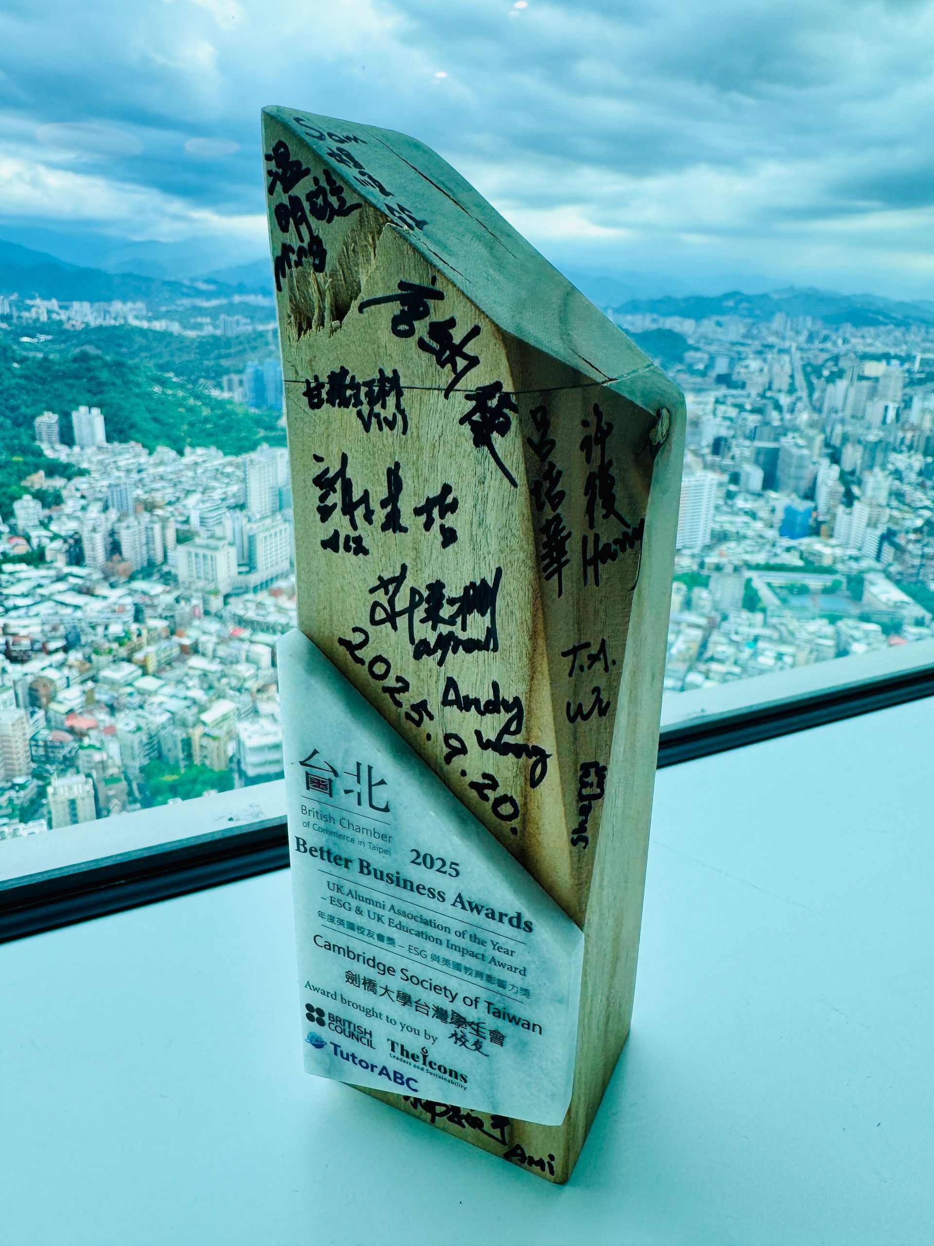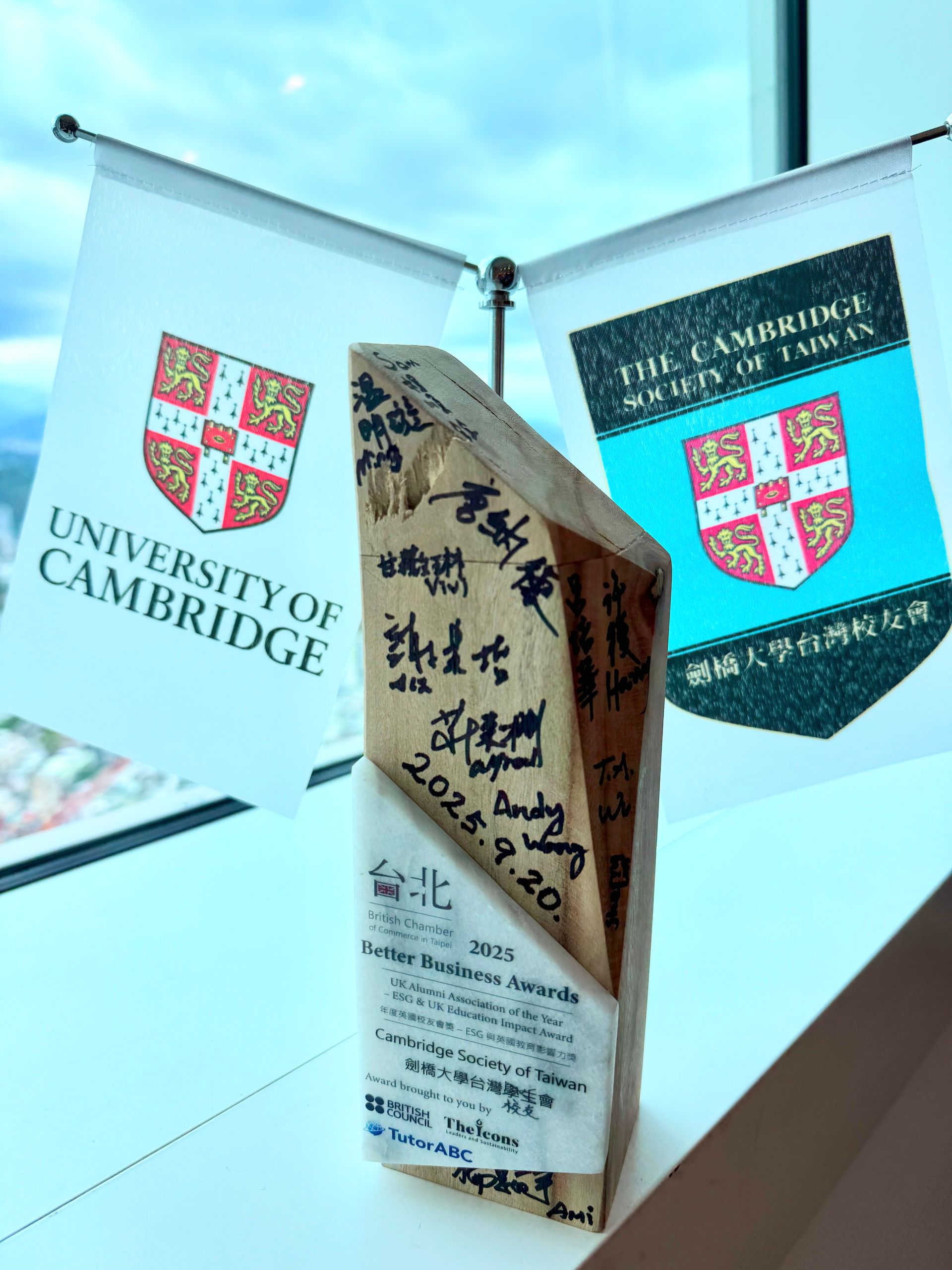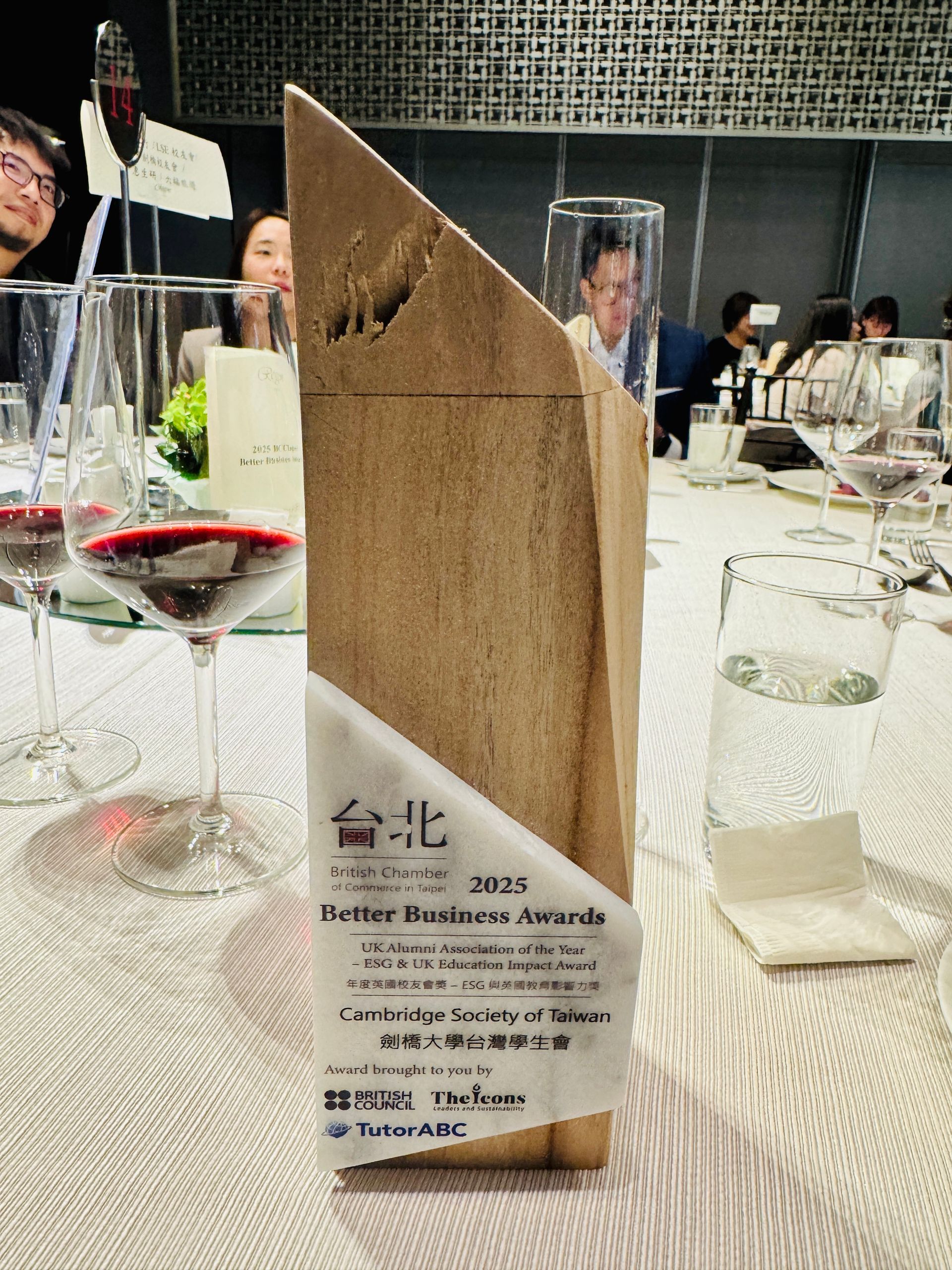 台北市英僑商務協會第九屆優良企業貢獻獎強調企業永續發展,針對七大領域檢視企業永續發展績效連結性、創新與其達成的效益,選拔對企業永續發展和社會責任有具體績效的企業團體以及個人,並予以公開表揚。每年均有過百單位投件參賽,恭喜劍橋大學台灣校友會於2025獲得「年度英國校友會獎 — ESG 與英國教育影響力獎 (UK Alumni Association of the Year – ESG & UK Education Impact Award) 」
